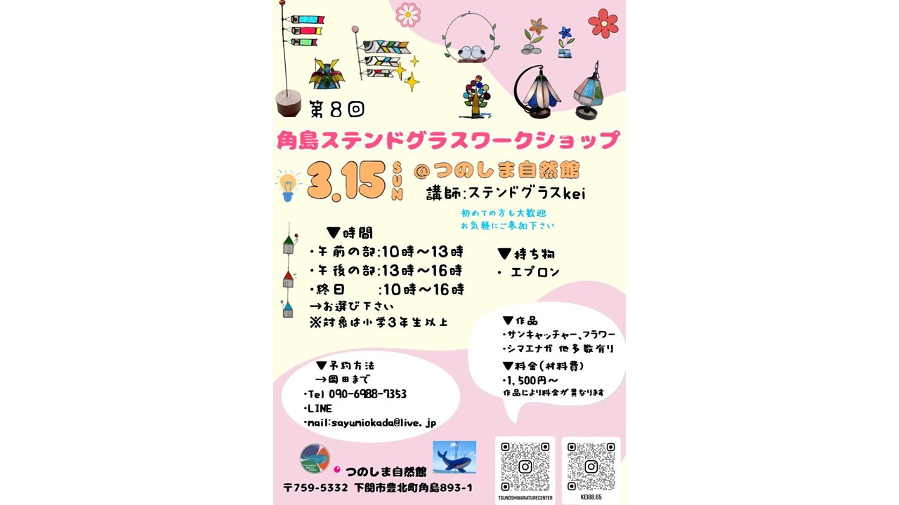 角島ステンドグラスワークショップについて【お知らせ】 2026.02.13 お知らせ イベント情報 Post Share Hatena Pocket RSS feedly Pin it ステンドグラスワークショップを行います❗️ 初めての方も大歓迎だそうです😄 午前の部、午後の部、終日からお選びください♪ 対象は小学3年生以上です‼️ 皆様のお越しをお待ちしております🙇♂️ Post Share Hatena Pocket RSS feedly Pin it 角島灯台150周年記念イベントについて【お知らせ】 前の記事