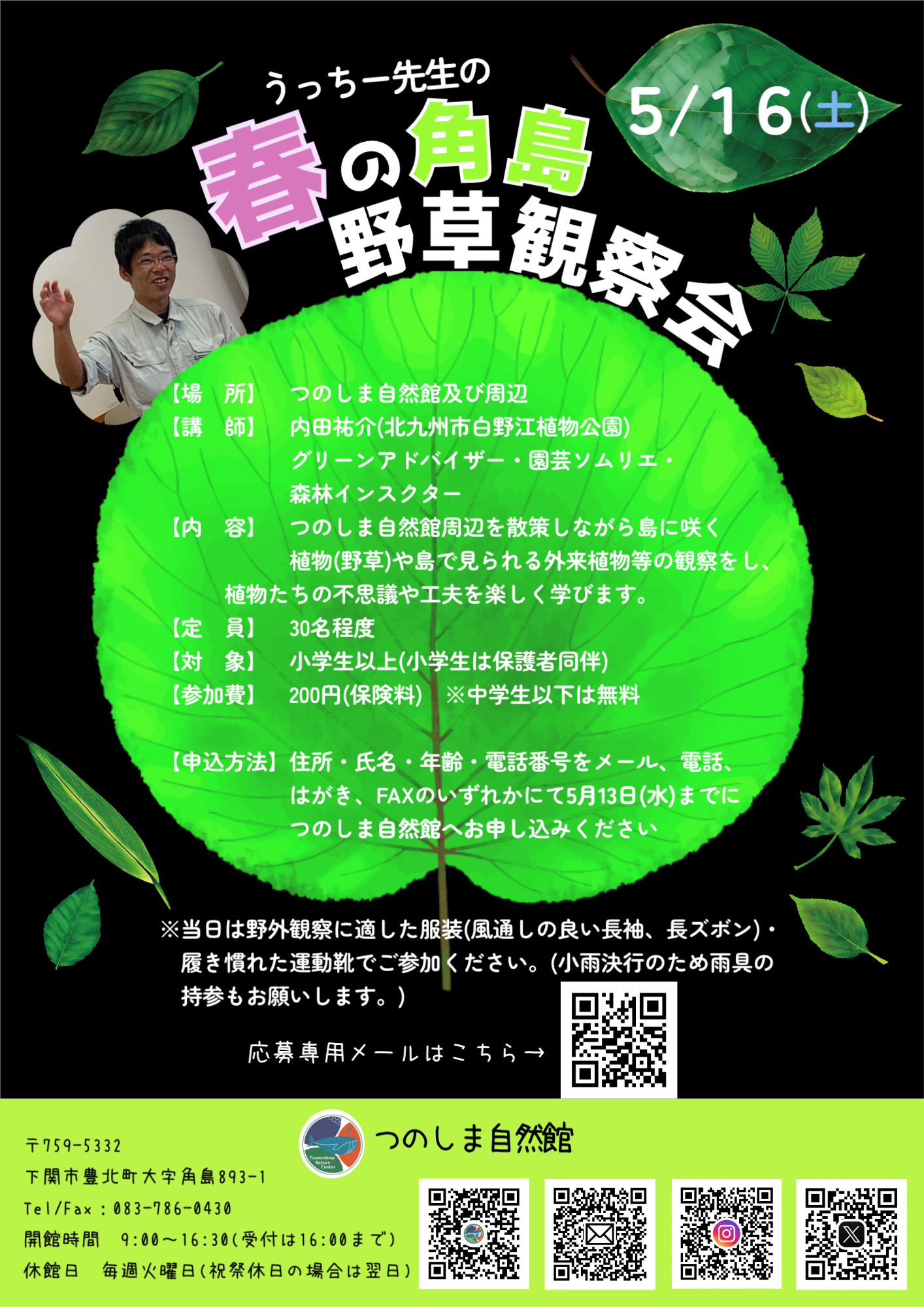 うっちー先生の春の角島野草観察会(5月16日実施)について【ご案内】 2026.04.13 5月16日(土)に「うっちー先生の春の角島野草観察会」を実施します。 皆様のご参加をお待ちしています。 Post Share Hatena Pocket RSS feedly Pin it 第9回角島ステンドグラスワークショップ(5月17日実施)について【ご案内】 前の記事 ビーチクリーンと磯の自然観察会(5月30日実施)について【お知らせ】 次の記事