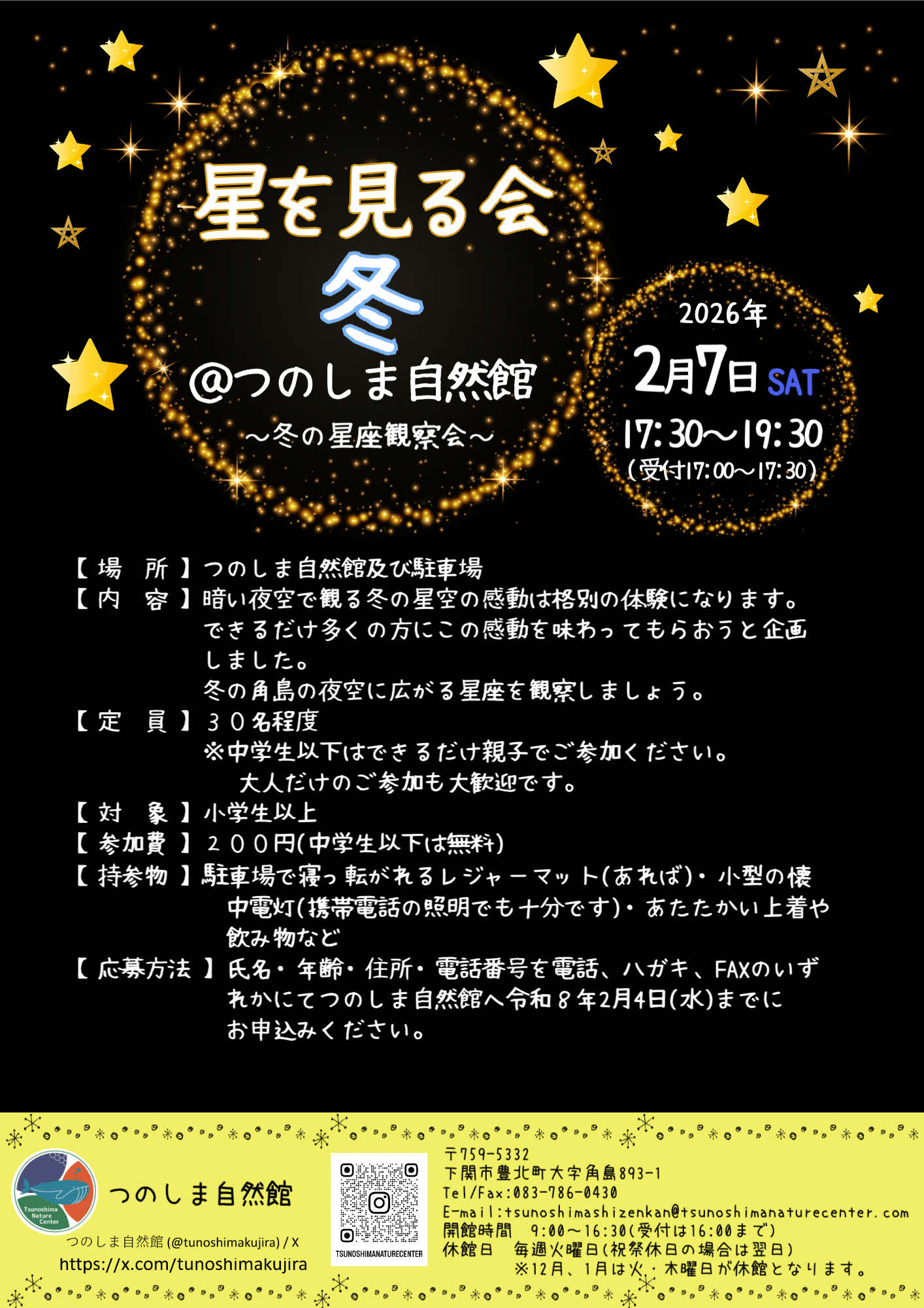 先日お知らせしたとおり、本日開催予定の『星を見る会冬@つのしま自然館』は中止し、2月7日(土)に開催することに決定しましたので、お知らせします✨