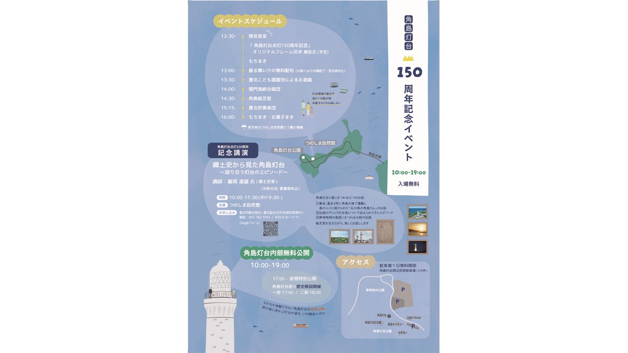 角島灯台150周年記念イベントについて【お知らせ】 2026.01.14 3月1日(日)角島灯台公園とつのしま自然館において、角島灯台150周年記念イベントが開催されます😊 当日は、角島灯台内部無料公開やもちまき、豊北吹奏楽団による演奏などが予定されています❗ 皆様のお越しをお待ちしています🙇♂️🙇♀️🙇♂️ Post Share Hatena Pocket RSS feedly Pin it 星を見る会冬@つのしま自然館について【お知らせ】 前の記事